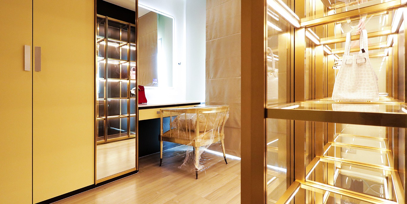 2. Bag Cabinet ชั้นโชว์กระเป๋า โครงอลูมีเนียมสีทอง