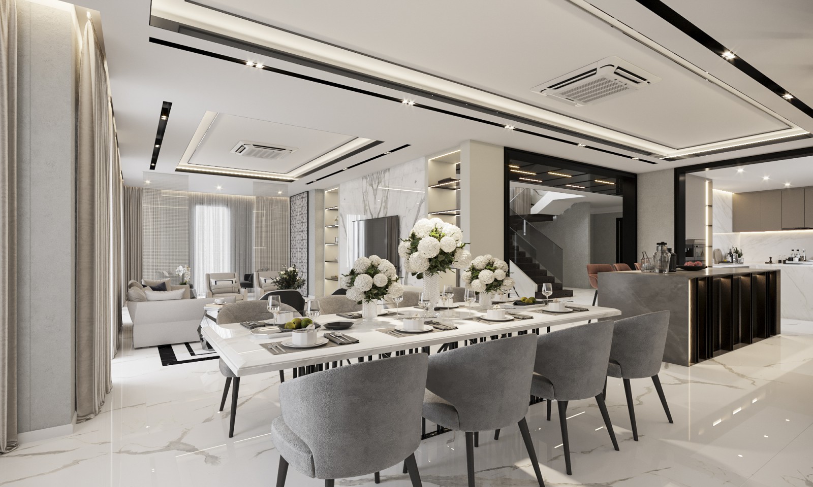 GRATIATHAILAND กับผลงานการออกแบบและรีโนเวทบ้าน บนพื้นที่ 500 ตารางเมตร ที่ภายในประกอบด้วยชุด Living Room, Party, Kitchen, Bedroom, Walk in closet, Working room และ Bathroom โดยตกแต่งสไตล์ Modern Luxury บ้านหรูของคนรุ่นใหม่ที่ทันสมัยและตอบโจทย์ไลฟ์สไตล์ได้อย่างลงตัว โดยผลงานชิ้นนี้เราเลือกใช้โทนสีขาว สีเทา และสีน้ำตาล มาเป็นโทนสีหลัก เพื่อดึงความทันสมัยที่หรูหราออกมาได้อย่างน่าประทับใจ ไฮไลท์ของผลงานชิ้นนี้อยู่ที่งานหินลายแพนด้า เพิ่มความโดดเด่นให้กับภายในอยู่ไม่น้อย โคมไฟ Chandelier ขนาดใหญ่ที่ห้อยระย้าโชว์ความอลังการตั้งแต่ก้าวแรกที่เข้าบ้าน สร้าง First Impression ให้กับทุกคนที่ได้มาเยือน เฟอร์นิเจอร์ทุกชิ้นถูกออกแบบราวกับงานศิลปะ สวยงาม สร้างสรรค์ มีระดับ และเสน่ห์ที่ชวนหลงใหล