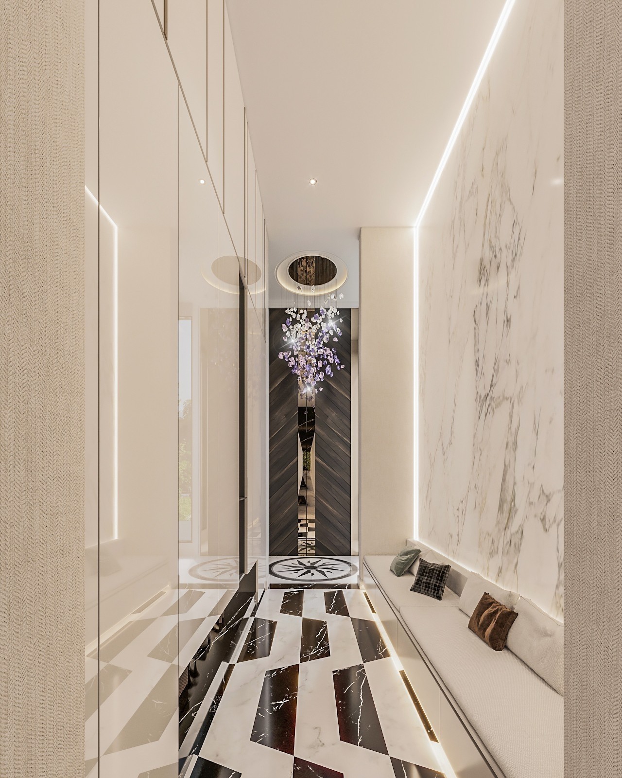 Interior Desing บ้านขนาดใหญ่ พื้นที่บิ้วอินมากกว่า 700 ตารางเมตร ออกแบบด้วยดีไซน์ Modern Luxury และมีความคลาสสิค ส่วนของผนังตกแต่งใส่เข้าไป ให้มีดีไซน์ โทนสีขาวและดำ วัสดุหินที่เลือกใช้ผนังโถงบันไดด้วยหินที่มีลวดลาย ตู้โชว์ วัสดุสีพ่น ซ่อนไฟ LED และ โคมไฟ ช่วยเพิ่มความหรูหรา ระดับ Hi-End ได้อย่างลงตัว สลับกับห้อง Dining room ด้วยโทนสีขาวและทองนำมาผสมผสาน และเลือกใช้เฟอร์นิเจอร์ลอยตัว เช่น เก้าอี้ สีครีมกันให้ดูโดดเด่น เพิ่มการดร๊อฟฝ้าและ ซ่อนไฟ LED warm white เสริมด้วยกระจกเงาเพิ่มความโปรงให้ห้องรับประทานอาหารดูเหมือนนั่งอยู่ที่โรงแรม ระดับ 5 ดาว ทำให้ภาพรวมของบ้านหลังนี้ดูสุดหรู เป็นอีกหนึ่งผลงานออกแบบที่ทาง กราเทีย ได้กั่นกรองและถ่ายทอดออกมา ในทุกๆรายละเอียดในทุกตารางนิ้วของบ้านหลังนี้ได้ผลงาน